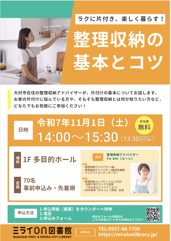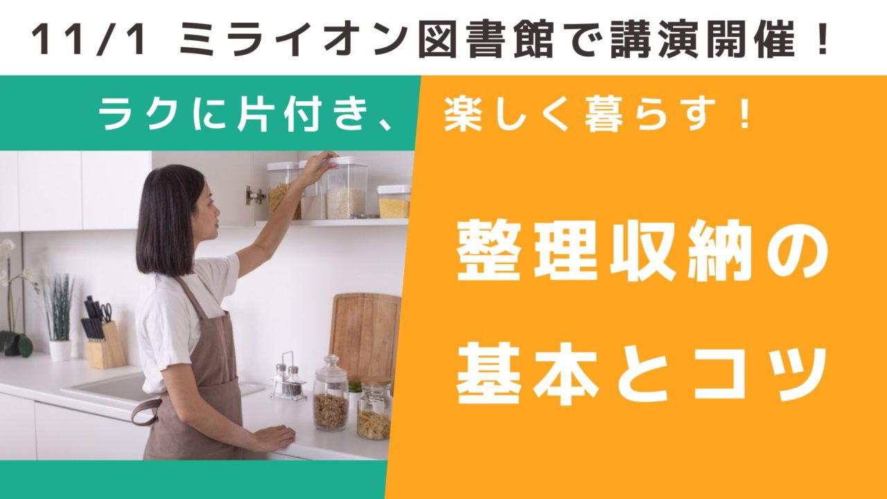 11/1(土)に大村市にあるミライオン図書館さんにて、整理収納に関する講演を行わせていただくことになりました✨
